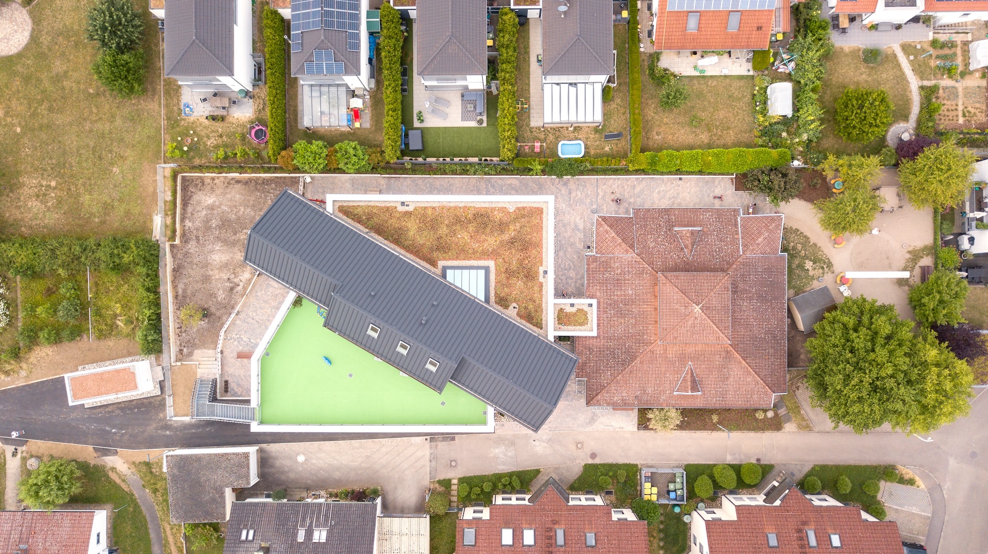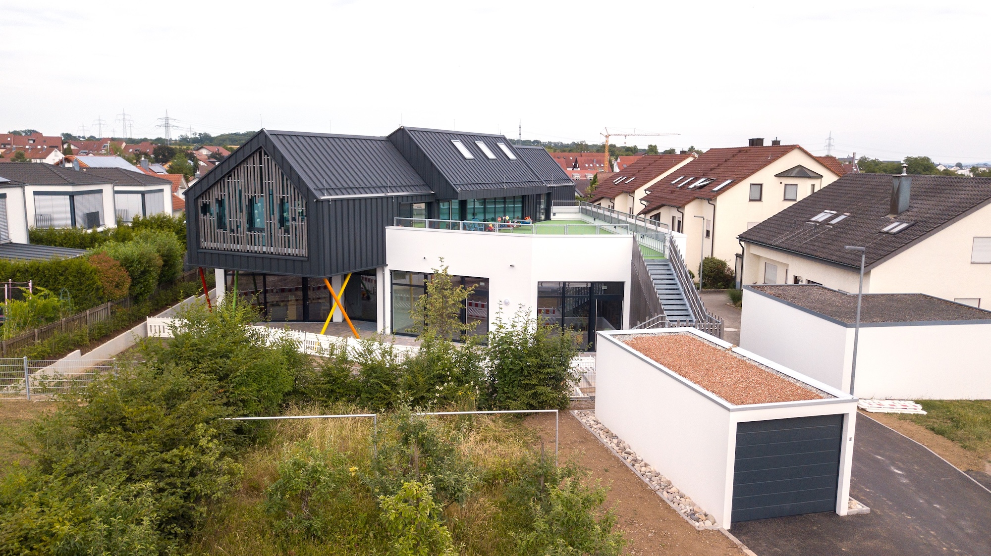 Ein großzügiger, teilweise überdachter Außenbereich mit auskragendem Bauteil erweitert die Spielflächen.